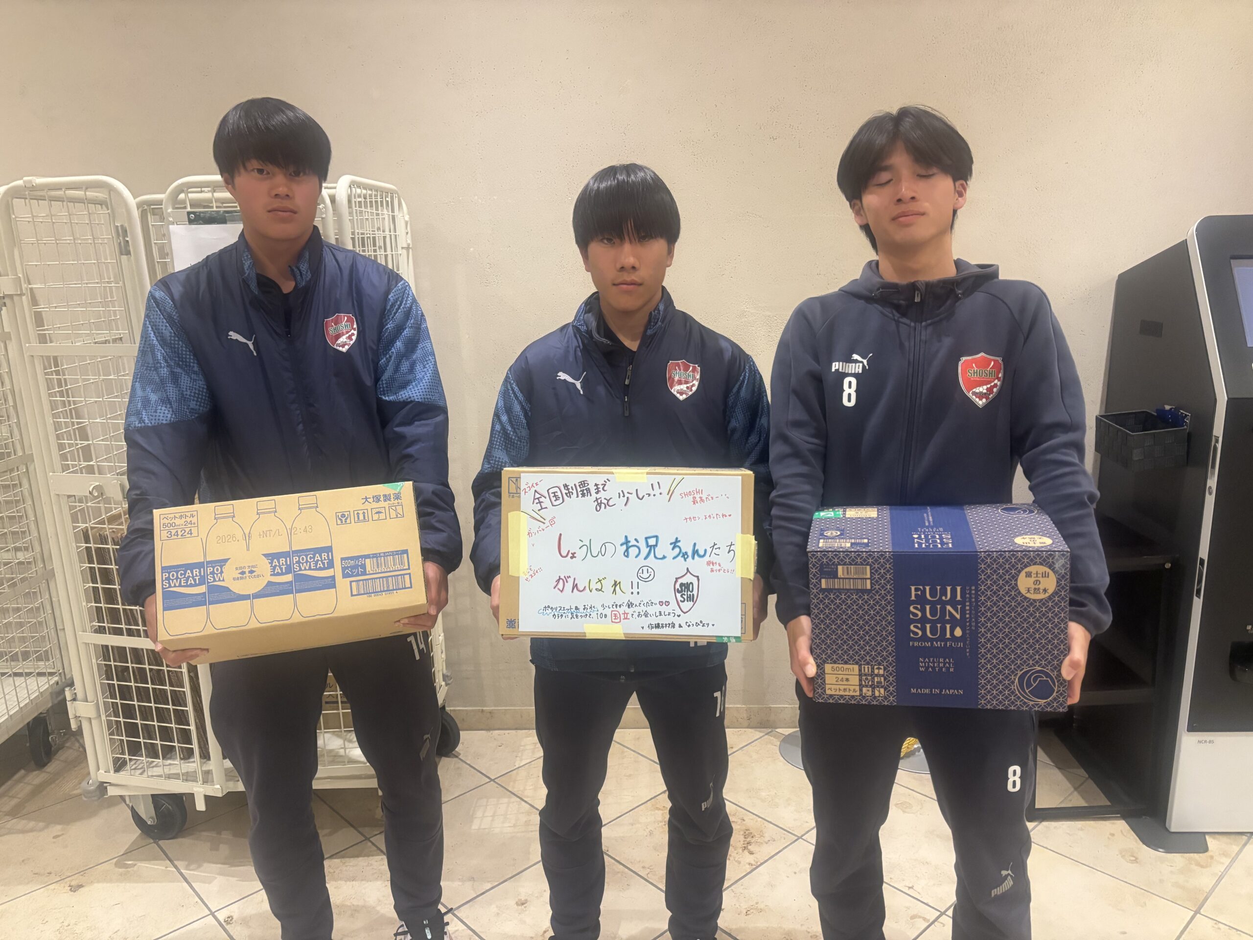 佐藤石材店様より飲み物の差し入れ 選手権中のTOPチームに、佐藤石材店様より水とポカリスウェットの差し入れをいただきました。いただいた飲み物を飲んで、準決勝に向けて皆で良い準備をしていきます。佐藤石材店様、誠にありがとうございました。 SHOSHI FC2026-01-05T21:22:33+09:002026年1月5日|スクールライフ, 未分類| FacebookTwitter電子メール